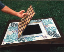 Die außergewöhnliche konkave Form ermöglicht ein sehr bequemes Sitzen. Der rechte Arm kann aufgestützt werden, die Blickrichtung fällt automatisch auf das leicht gedrehte Spielfeld. Bei einem Schachspiel ist so ein Höchstmaß an Konzentration möglich. Das Blattwerk-Mosaik, welches die Spielfläche umrahmt, schafft eine harmonische Atmosphäre, ohne jedoch durch konkrete Details abzulenken.