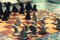 Der Figurensatz ist Bestandteil des Schachtisches. Ausschließlich für diesen einzigartigen Tisch wurden alle 32 Figuren modelliert, gebrannt und glasiert-jede einzelne in Handarbeit-jede einzelne ein Unikat. Darüber hinaus sind sie sehr robust und deshalb auch zum Spielen geeignet. Ihre individuelle Formensprache charakterisiert das Wesen jeder einzelnen Figur im Schachspiel. Ihre gesamtheitliche Konzeption unterstützt die Wirkung des Tisches. Besucher einer RuhnICON-Ausstellung, welche die Figuren ausprobierten, kamen sehr schnell mit der ungewohnten Form zurecht und spielten ernsthafte Partien bis zum Ende durch.